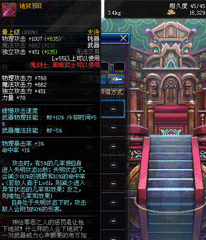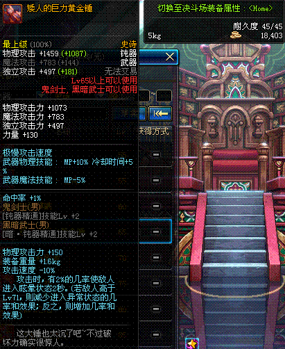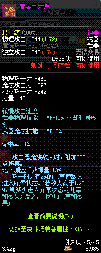 | 35 | 黄金巨力锤 | *黄金王维迪尔 掉落(地下城: 黄金矿洞) *在NPC克伦特的物品店购买(阿拉德陨石 ×150) |