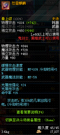 | 60 | 怒雷麒麟 | *Lv59~66深渊地下城怪物掉落 *攻坚队完成安徒恩团队模式的[讨伐安徒恩]任务时,获得的奖励。 *歌兰蒂斯·格拉西亚 出售 (宇宙灵魂×230) |