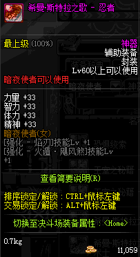| 鬼剑士 | 神枪手 | 格斗家 | 魔法师 | 圣职者 | 暗夜使者 | 布甲 | 皮甲 | 重甲 | 轻甲 | 板甲 | 饰品 |