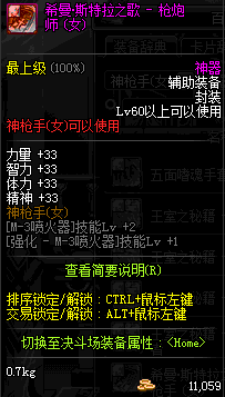 | 鬼剑士 | 神枪手 | 格斗家 | 魔法师 | 圣职者 | 暗夜使者 | 布甲 | 皮甲 | 重甲 | 轻甲 | 板甲 | 饰品 |