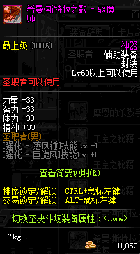 | 鬼剑士 | 神枪手 | 格斗家 | 魔法师 | 圣职者 | 暗夜使者 | 布甲 | 皮甲 | 重甲 | 轻甲 | 板甲 | 饰品 |