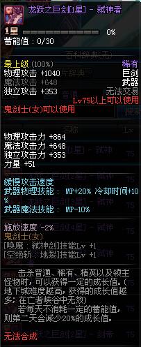 | 74 | 真·魔剑 - 阿波菲斯 | * 设计图(70LV以上普通地下城 登场的NPC加百利 出售) 强大的怨念×10, 戮蛊的眼睛×2246, 虚空魔石×117, 上级元素结晶×729, 小铁柱的火炉使用卷×7 *魔剑阿波菲斯 → 用远古神器装备进化书升级(NPC船长鲁特 出售) |