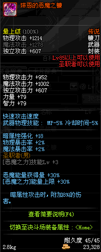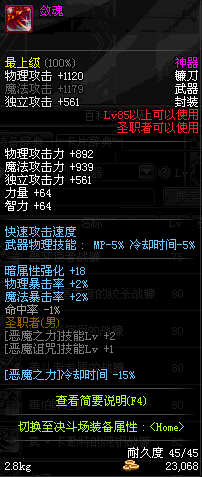 | 85 | 琳恩的恶魔之镰 | * 盗技幽魂 掉落(地下城:魂:悲鸣洞穴 3图) *设计图(魂:悲鸣洞穴 登场的NPC加百利 出售) |
