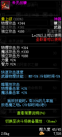 | 25 | 帝灵战镰 | *皇后克拉拉 掉落(绝望的棋局) *在NPC阿尔伯特·伯恩斯坦的物品店购买(阿拉德陨石×60) |