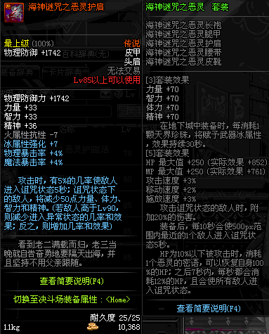 | 85 | 海神谜咒之恶灵护肩 | 昨日之巴斯顿 掉落 (在远古地下城里出没。) *从NPC鲁特的物品店出售的[海神谜咒防具礼盒]中获得 *船长鲁特 出售 (深海诅咒 : 解咒法×60) |