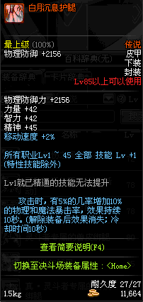 | 45 | 凯诺的银光腿甲 | *落雷凯诺 掉落(冰刺庭院) *在NPC敏泰的物品店购买(阿拉德陨石×147) |