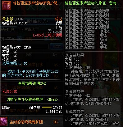 | 85 | 格拉西亚家族遗物狼魂护腿 | *昨日之巴斯顿 掉落 (在远古地下城里出没。) *从NPC鲁特的物品店出售的[格拉西亚家族遗物 - 防具礼盒]中获得 |