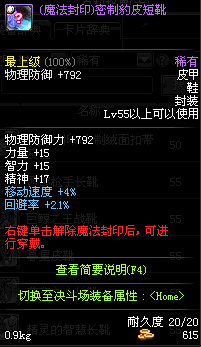 | 15 | (魔法封印)密制长皮靴 | *Lv13~21普通地下城怪物掉落 *完成[[魔法封印防具]天才武道家的试炼(3/3)]任务 *使用Lv13~21怪物掉落的设计图进行制作 |