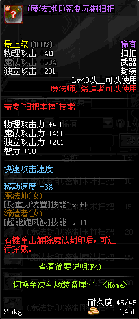 | 40 | (魔法封印)密制赤铜扫把 | *Lv39~46普通地下城怪物掉落 *完成[变异的美神恩泽]任务 *使用Lv39~46怪物掉落的设计图进行制作 |