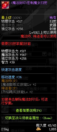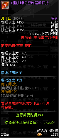 | 45 | (魔法封印)密制强风扫把 | *Lv45~51普通地下城怪物掉落 *完成[罗斯特的破绽]任务 *使用Lv45~51怪物掉落的设计图进行制作 |