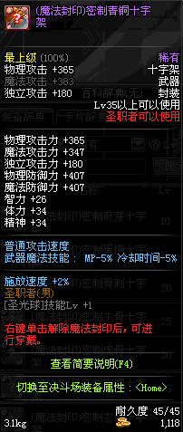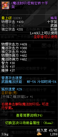 | 40 | (魔法封印)密制玄铁十字架 | *Lv39~46普通地下城怪物掉落 *完成[变异的美神恩泽]任务 *使用Lv39~46怪物掉落的设计图进行制作 |