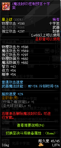 | 60 | (魔法封印)密制预言十字架 | *Lv58~66普通地下城怪物掉落 *完成[消灭机关兵]任务 *使用Lv58~66怪物掉落的设计图进行制作 |