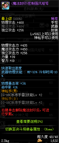 | 50 | (魔法封印)密制强风短弩 | *Lv50~56普通地下城怪物掉落 *完成[黑色噩梦投影出来的世界]任务 *使用Lv50~56怪物掉落的设计图进行制作 |
