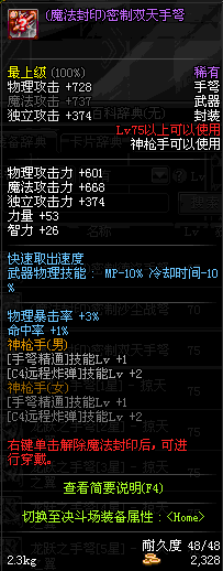 | 75 | (魔法封印)密制双天手弩 | *Lv75~81普通地下城怪物掉落 *完成[调查紫雾团]任务 *使用Lv75~81怪物掉落的设计图进行制作 |