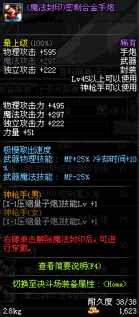 | 45 | (魔法封印)密制合金手炮 | *Lv45~51普通地下城怪物掉落 *完成[罗斯特的破绽]任务 *使用Lv45~51怪物掉落的设计图进行制作 |