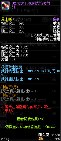 | 50 | (魔法封印)密制火焰喷射器 | *Lv50~56普通地下城怪物掉落 *完成[黑色噩梦投影出来的世界]任务 *使用Lv50~56怪物掉落的设计图进行制作 |