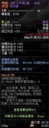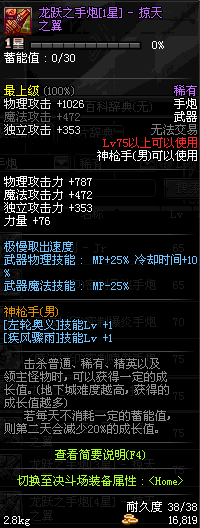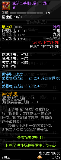 | 75 | 龙跃之手炮[1星] – 毁灭者 | *完成二次觉醒任务后可以从NPC小铁柱处获得此道具。 | ||
