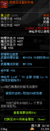 | 85 | 西部无法者的手炮 | *昨日之巴斯顿 掉落 (在远古地下城里出没。) *从NPC鲁特的物品店出售的[西部无法者武器礼盒]中获得 *船长鲁特 出售 (气吞山河图×800) |