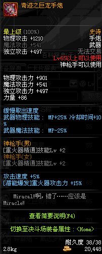 | 65 | 奇迹之巨龙手炮 | *Lv64~71深渊地下城怪物掉落 *在NPC沉默之克雷娅的物品店购买 |