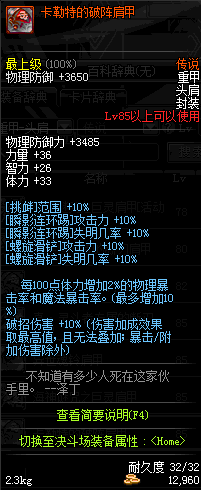 | 85 | 卡勒特的破阵肩甲 | *突击队长兰蒂卢斯 掉落(卡勒特指挥部 6图) *设计图(卡勒特指挥部 登场的NPC加百利 出售) |