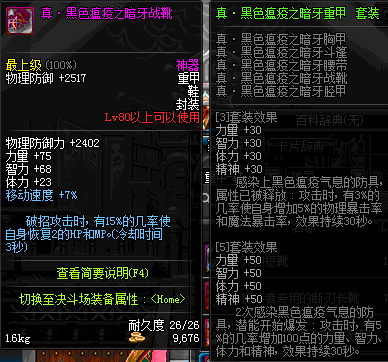 | 80 | 真 · 黑色瘟疫之暗牙战靴 | *黑色瘟疫之暗牙战靴 → 用远古神器装备进化书升级(NPC船长鲁特 出售) | 真·黑色瘟疫之暗牙 套装 | |