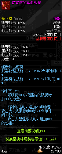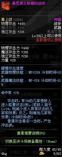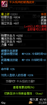 | 45 | 萨乌塔的冥血战斧 | *牛头王萨乌塔 掉落(冰刺庭院) *在NPC敏泰的物品店购买(阿拉德陨石×240) |