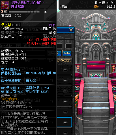 | 75 | 龙跃之自动手枪[3星] – 绯红玫瑰 | *完成二次觉醒任务后可以从NPC小铁柱处获得此道具。 | ||