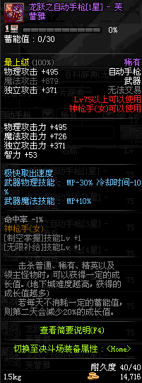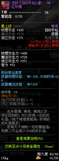 | 75 | 龙跃之自动手枪[4星] – 毁灭者 | *完成二次觉醒任务后可以从NPC小铁柱处获得此道具。 | ||