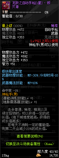 | 75 | 龙跃之自动手枪[5星] – 毁灭者 | *完成二次觉醒任务后可以从NPC小铁柱处获得此道具。 | ||
