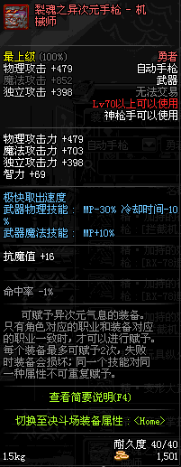 | 75 | 龙跃之自动手枪[1星] – 机械之灵 | *完成二次觉醒任务后可以从NPC小铁柱处获得此道具。 | ||