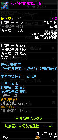 | 40 | 海鲨王加顿的鲨鱼枪 | *海鲨王加顿 掉落(地下城: 鲨鱼栖息地) *伊莎杜拉 出售(阿拉德陨石×195) |